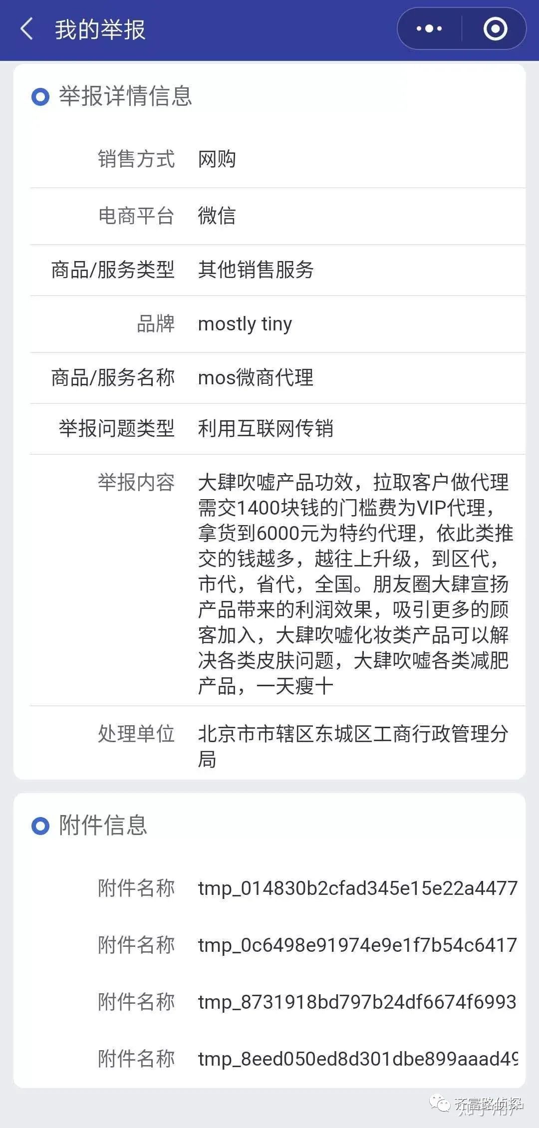 目前,已有多名MOS前代理向当地市场监管部门进行实名举报。接下来如何收场,侦探将会持续关注。 (原标题:宣称糖果饮料能减肥、代理层级高达6级,MOS被实名举报传销) 责任编辑:蓝莓 【特别声明:部分文字及图片来源于网络,仅供学习和交流使用,不具有任何商业用途,其目的在于传递更多的信息,并不代表本平台赞同其观点。版权归原作者所有,如涉版权或来源标注有误,请及时和我们取得联系,我们将迅速处理,谢谢!】 解读新闻热点、呈现敏感事件、更多独家分析,尽在以下微信公号,扫描二维码免费阅读。