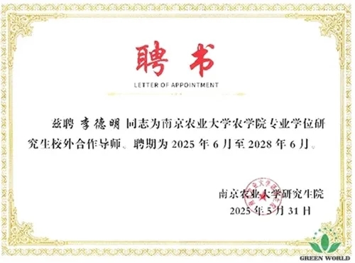 【直报网北京6月16日讯】(沃德绿世界)近日,南京农业大学举行了专业学位研究生校外导师聘任仪式暨座谈会,正式聘任绿世界国际董事长李德明博士担任南京农业大学专业学位研究生校外导师。颁授仪式于大学行政会议中心举行,绿世界国际高层管理团队与校方领导共同见证聘任过程。 ![]() 南京农业大学党委常委、副校长朱艳教授代表校方颁授聘任证书,农学院院长张红生教授等学科带头人参与与会研讨。绿世界国际中国区副总经理刘少波先生、南京分公司常务副总经理刘巧英女士作为企业方代表列席本次仪式。 ![]() 在后续召开的座谈会上,校企双方就产学研协同创新机制、专业学位研究生实践培养模式等核心议题展开深度研讨。李德明博士表示作为校外导师,将充分发挥绿世界国际在行业实践中的优势资源,积极配合校方完善"双师型"培养模式,为专业学位研究生提供实践指导与产业前沿知识分享。集团将持续深化与南京农业大学的产学研合作,共同探索创新型人才培养机制。