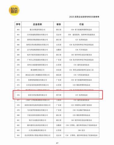 此次荣登“2025民营企业发明专利500家”榜单,既是对好医生集团在知识产权领域长期深耕、厚积薄发的充分肯定,更是对未来持续创新、引领发展的有力鞭策。展望未来,好医生集团将继续深化其体系化的知识产权战略,通过更精准的创新挖掘、更前瞻的全球布局和更高效的资产管理,推动更多高价值专利的产出与应用,将知识产权这把高质量发展的“金钥匙”深深植入企业核心竞争力的构建过程中,为中国医药产业的创新升级与迈向全球价值链高端贡献更大的力量。 (原标题:好医生荣登“民营企业发明专利500家榜单”) 责任编辑:一一 【特别声明:部分文字及图片来源于网络,仅供学习和交流使用,不具有任何商业用途,其目的在于传递更多的信息,并不代表本平台赞同其观点。版权归原作者所有,如涉版权或来源标注有误,请及时和我们取得联系,我们将迅速处理,谢谢!】 解读新闻热点、呈现敏感事件、更多独家分析,尽在以下微信公号,扫描二维码免费阅读。