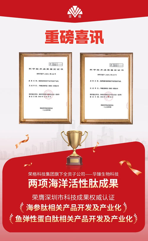【直报网北京1月9日讯】(荣格) 科技,是荣格与生俱来的基因。 作为一家致力于成为持续推动人类健康进步的科技公司,荣格始终将科技创新置于战略核心。多年来,我们持续深耕生命科学、功能营养与生物活性物质前沿领域,构建起从基础研究到产业转化的全链条创新体系。 重磅科技成果再添新彩! 近日,荣格科技集团旗下全资子公司——华臻生物科技(深圳)有限公司,在海洋活性肽产业化领域实现两项重大突破! ![]() 2025年12月25日,经深圳市科技创新局授权,由深圳市科技中介同业公会组织召开科技成果鉴定会,华臻生物两项核心技术成果: 《海参肽相关产品开发及产业化》 《鱼弹性蛋白肽相关产品开发及产业化》 双双通过权威专家评审,正式获得《科学技术成果鉴定证书》! 证书编号:深科同鉴字〔2025〕第1118号、第1119号 ![]()