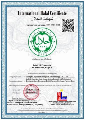 【直报网北京1月19日讯】(安惠)2026年1月13日,江苏安惠生物科技有限公司(Jiangsu Alphay Biological Technology Co., Ltd.)获得国际HALAL认证证书,证书编号为SSPY-201318-34608。该认证由马来西亚伊斯兰发展署(JAKIM)认可,标志着安惠生物科技的相关核心产品符合伊斯兰教法(Shariah)规定的HALAL标准,为其在全球清真市场的布局提供了重要保障。 ![]() HALAL即“清真”,是符合伊斯兰教教义的饮食、用品等相关标准的统称,其要求涵盖原料采购、生产加工、仓储运输等全环节,是全球穆斯林群体消费选择的核心依据;同时,因其严苛的品质管控,HALAL认证受到众多非穆斯林消费者的广泛认可。