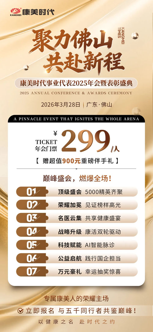 来了,来了,它终于来了! 【直报网北京3月4日讯】(康美时代)万众瞩目,期待已久的康美时代事业代表2025年会暨表彰盛典,将于2026年3月28日,在广东佛山盛大启幕! 如果你渴望见证榜样加冕的高光时刻,期待与名医大咖近距离碰撞智慧火花,想要抢先锁定行业新风向、把握财富新机遇,展现专属康美人的自信锋芒,那本次年会,就千万别错过! 这一次,让我们相约广东佛山,凝聚康美力量,践行健康中国使命,携手耀启2026全新征程! ![]() 重磅福利,超值回馈 除顶级配置、干货知识、荣耀与机遇外,本次年会,特为每位康美人准备诚意满满的重磅福利,真正做到超值投入、超高回报、物超所值! 壹 超值门票福利 一场高规格舞台、高价值内容、高颜值盛典的巅峰盛会,门票仅需299元/人!您购买的将不仅是一张入场券,更是通往健康、机遇与荣耀的无限可能! ![]() 贰 重磅伴手礼,人人有份 凡成功报名参会的康美伙伴,均可免费获赠价值超900元的专属健康伴手礼! 百年品牌联名爆品、国医大师调配臻品、四季养生健康佳品...多款康美时代明星产品,都将统统装进您的行囊! ![]() △超值伴手礼 席位有限,先到先得 荣耀席位现已全面开放! 想近距离目睹榜样风采?想清晰聆听大咖干货?想抢占C位视野,沉浸式感受全场氛围?别犹豫,别观望,立即报名锁定您的专属席位! 这将是一场 致敬荣耀的表彰盛宴 擘画蓝图的战略峰会 汲取智慧的学习平台 布局未来的事业起点 3月28日,让我们相约广东佛山 以健康之名,赴时代之约 康美时代事业代表2025年会暨表彰盛典