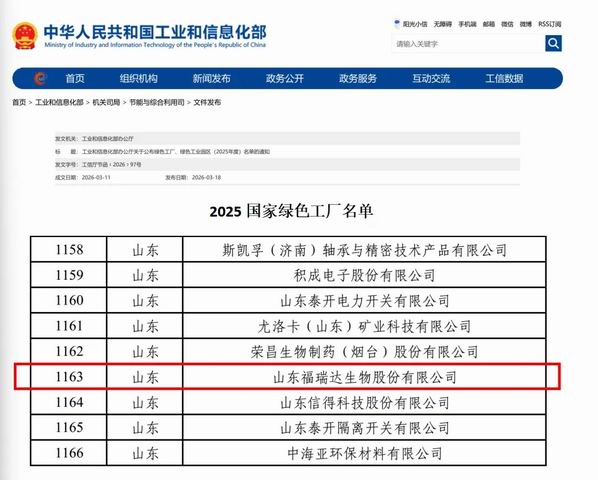 近日,工业和信息化部正式公布2025年度国家级绿色工厂名单,山东福瑞达生物股份有限公司凭借在绿色智造、节能减排及可持续发展领域的深耕细作与卓越实践,成功跻身国家级绿色工