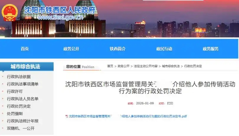 【直报网北京1月26日讯】(中国质量万里行)1月9日,辽宁省沈阳市铁西区市场监督管理局依法对一名介绍他人参加“维卡币”传销活动的当事人作出行政处罚决定。该案源于司法机关在办理刑事案件过程中,发现违法行为尚不构成犯罪,遂依法移送市场监督管理部门进行行政处罚,体现了行政执法与刑事司法的有效衔接。