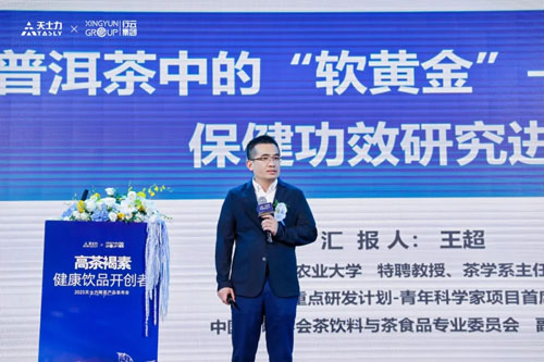 立信 科学为本 构建“医学级消费品”信任基石 在"立信"篇章,天士力降茶通过多重科学验证夯实产品公信力。湖南农业大学茶学系主任王超博士首先从成分本源出发,权威阐述了普洱茶中的关键功能因子——茶褐素的科学研究进展。他将茶褐素誉为“普洱茶中的软黄金”,系统介绍了其在调节糖脂代谢等方面的独特价值,为天士力降茶的功效奠定了坚实的成分理论基础。
