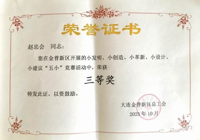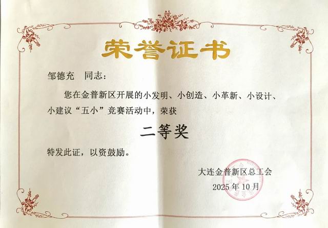 近日,从金普新区总工会传来喜讯,大连双迪科技股份有限公司(以下简称为:双迪股份)在2025年度“五小”创新成果评选活动中表现卓越,申报的四项成果全部获奖。其中设备管理部