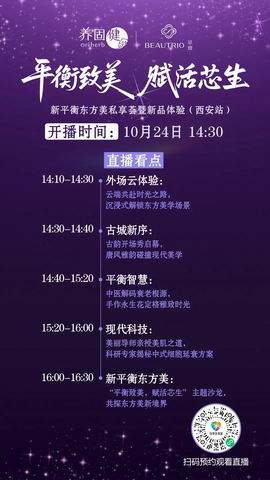 新品上市 1+5城市 新平衡东方美私享荟陆续启幕 【直报网北京10月24日讯】(无限极)养固健×萃雅“赋活组合”已于10月20日重磅登场!伴随“赋活”新品的发布,以“平衡致美 赋活芯生”为主题的新平衡东方美私享荟暨新品体验系列活动,也同步开启1+5城市巡游模式——10月21日广州站、10月22日成都站&沈阳站、10月24日西安站&郑州站、10月25日南京站,每一站都将“平衡致美”理念与当地风情文化相融合,打造专属城市的美学记忆,邀大家共探年轻芯生的秘诀。 没到现场? 新平衡东方美西安站 邀你直播 “云打卡” 若你未能来到活动现场,别担心! ![]() 10月24日14:30,“平衡致美 赋活芯生”新平衡东方美私享荟暨新品体验西安站将开启线上直播,邀你“云穿越”千年古城,沉浸式感受不一样的东方之韵。 直播看点提前剧透 ![]()