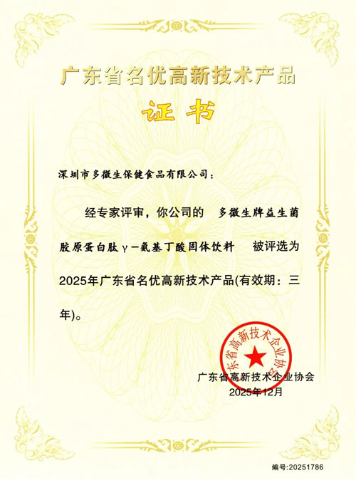 喜报 益生菌胶原蛋白肽 γ-氨基丁酸固体饮料 被评为2025年 广东省名优高新技术产品