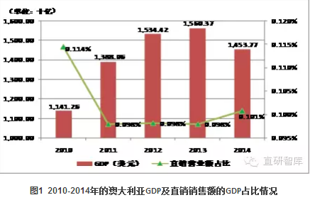 【直报网10月30日讯】(世界直销研究院)澳大利亚素有“骑在羊背上的国家”和“坐在矿车上的国家”之美誉,可想而知,澳大利亚是以养羊业和采矿业闻名于世。不错地,近200年以来,养羊业一直是澳大利亚经济的主要支柱和大宗创汇行业,同时作为世界上最大的矿产品出口国,采矿业也是澳大利亚经济中的支柱性部门之一。根据往年的平均数据显示,这两大产业的GDP占比都超过了4%。然而,回到我们最为关心的直销业,GDP占比又有多少呢?我们根据世界银行及世界直销协会联盟的统计数据,汇出了2010-2014年的澳大利亚GDP及直销销售额的GDP占比情况(如图1所示)。