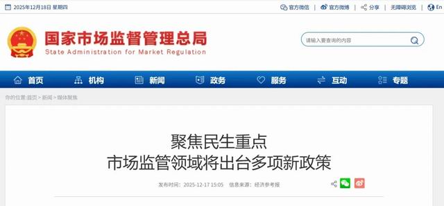 【直报网北京12月19日讯】(国家市场监督管理总局)12月16日,在市场监管总局四季度新闻发布会上,记者获悉,围绕规范平台经济、强化食品安全、加强反垄断反不正当竞争、加强和保障纤维制品质量安全监管等多个民生重点领域,市场监管总局将出台多项新的政策文件。 ![]() 其中,促进平台经济规范健康发展成为重点。具体来看,市场监管总局新闻发言人、新闻宣传司司长王秋苹介绍,为规范平台经济,两部新规《直播电商监督管理办法》《网络交易平台规则监督管理办法》拟于近期出台。同时,根据《中华人民共和国反垄断法》等规定,市场监管总局正积极推进《互联网平台反垄断合规指引》(下称《指引》)制定工作。目前,公开征求意见已结束。 王秋苹进一步介绍,为确保《指引》落地见效,将重点做好三方面工作:一是“送政策上门”,讲清楚、说明白。通过专题培训、简明解读等方式,帮助企业准确理解、自觉合规。二是“听企业心声”,畅渠道、解难题。建立常态化沟通机制,加强行业指导,做到精准预警、防微杜渐。三是“亮监管利剑”,零容忍、强震慑。坚决查处各类垄断行为,加大曝光力度,切实维护市场公平。 在强化食品安全方面,《食品委托生产监督管理办法》《食品销售连锁企业落实食品安全主体责任监督管理规定》两项制度即将发布,筑牢“舌尖上的安全防线”。 在加强反垄断反不正当竞争方面,市场监管总局还将公布新修改的《禁止垄断协议规定》,出台《制止滥用行政权力排除、限制竞争行为规定》,为各类经营主体营造更加公平、透明、可预期的发展环境。 此外,为加强和保障纤维制品质量安全监管,修订后的《纤维制品质量监督管理办法》即将发布,将更好适应产业发展和监管需要。近期市场监管总局还将会同有关部门,启动“人工智能百项国家标准建设专项行动”,以标准引领创新。 四季度以来,市场监管总局聚焦民生领域,已经打出了监管“组合拳”,重点从两个方向发力:一是完善基础制度,优化发展环境。出台《市场监督管理信用修复管理办法》,构建了更加科学完备的信用修复机制;发布《商业银行收费行为执法指南》,为规范商业银行收费行为提供了精准标尺,降低企业融资成本。 二是强化重点监管,回应民生期待。市场监管总局公布《工业产品生产许可证实施细则通则》及24种产品生产许可证实施细则,进一步强化高风险产品质量安全源头治理。修订《婴幼儿配方乳粉产品配方注册管理办法》,明确对婴幼儿配方液态乳产品配方实行注册管理,守好婴幼儿“口粮”的安全底线;出台城镇供水供电供气公用企业价格行为和计量行为两个合规指南,加强水电气计量和价格监管。