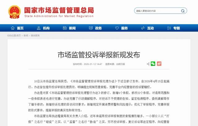 【直报网北京1月15日讯】(本质视点)2026年1月,国家市场监督管理总局发布第121号令,修订出台《市场监督管理投诉举报处理办法》(以下简称《办法》),自2026年4月15日起施行。这一新规是对2019年《市场监督管理投诉举报处理暂行办法》的全面升级,新增6个条款,修改22个条款,旨在适应市场监管新形势新要求,提升投诉举报处理质效,更好保护消费者和经营者合法权益。 ![]() 新规修订背景 《市场监督管理投诉举报处理暂行办法》自2020年1月1日施行以来,在实现机构改革“五线合一”、提升投诉举报处理质效、维护消费者权益上发挥了重要作用。随着形势发展变化,全面修订变得必要。 此次修订首先是落实上位法要求。《中华人民共和国消费者权益保护法实施条例》自2024年7月1日起实施,对投诉举报处理程序作出了新规定,《办法》需要全面落实这些规定。 其次是回应实践需求。原规章施行5年来,市场监管面临新形势。例如,电子商务领域投诉总量大、增速快,平台责任落实不到位,需进一步完善管辖权;随着国内超大规模市场扩容,投诉举报数量攀升,需优化处理流程、提升处理效能。 第三是保护各方权益。近年来,一些人滥用投诉举报制度滋扰经营主体,损害营商环境和市场秩序,挤占普通消费者维权渠道,有必要更好统筹消费者依法维权和经营者依法经营。 四大修订亮点 规制恶意索赔 防止制度滥用 针对日益严重的恶意索赔问题,《办法》设立了多项规制措施。 明确基本原则:第七条规定,提出投诉举报应当遵守法律法规,不得滥用投诉举报权利、利用投诉举报牟取不正当利益,侵害经营者合法权益,扰乱市场秩序。 完善投诉受理范围:第十六条规定,对提供虚假投诉材料、冒用他人名义投诉、拒不配合核验真实身份的不予受理。第十条要求投诉人提供真实身份信息和相应的事实依据。 界定“生活消费需要”:新增第十七条列举了判断“生活消费需要”的具体因素,包括购买商品的数量、次数、频率等与商品保质期或通常消费习惯明显不符;同一投诉人对同一经营者、同一类商品服务、同一类问题短期内大量投诉等。 打击违法索赔:第四十二条规定,市场监督部门发现投诉举报人涉嫌通过夹带、掉包、造假等方式骗取赔偿或进行敲诈勒索的,移送公安机关处理。 优化投诉管辖 压实平台责任 《办法》对平台内经营者(网店、直播间)的投诉管辖权进行了完善。第十三条规定,对平台内经营者的投诉,由其在平台公示的地址所在地县级市场监管部门或平台经营者住所地县级市场监管部门处理;未在平台依法公示地址或通过公示地址无法取得联系的,由平台经营者住所地县级市场监管部门处理。 这一规定以“公示的地址”代替“实际经营地”,有助于统一标准,为消费者维权和市场监管部门确定管辖提供明确指引。如未公示或公示地址不实,由平台所在地市场监管部门督促平台履行法定义务。 优化举报程序 提高处理效能 为提高举报处理效率,《办法》进行了一系列创新。 完善举报形式要件:第二十八条规定举报人需提供涉嫌违法的具体线索和相应的事实依据,以提高举报的真实性和有效性。 创新举报处理机制:第三十五条规定,同一举报人就同一涉嫌违法事实重复举报同一被举报人的,不再另行处理;以补充新事实为由再次举报的可合并处理。 强化广告同案管辖:第三十二条删除了广告举报的移送规定,要求广告发布者所在地市场监管部门收到举报后应对广告是否违法进行核查,构成违法的应对广告主、广告经营者同案管辖。 强化权益保护 推动纠纷化解 为加强消费者权益保护,《办法》新增了多项措施。 新增回访问效机制:第二十六条规定市场监管部门可采取抽查、回访等方式加强对投诉处理情况的评估。 增加告知内容:第十五条规定对投诉不予受理的,应告知理由和其他解决途径;第二十五条规定对终止调解或调解结果不服的,可通过民事诉讼、仲裁等途径解决。 完善鉴定检测:第二十二条规定投诉人和被投诉人对鉴定检测机构无法协商一致时,市场监管部门可以指定鉴定检测机构。 优化调解期限:第二十三条将调解期限从四十五个工作日改为六十个自然日,方便当事人计算。 健全消费纠纷多元化解体系 《办法》推动健全消费争议多元化解机制,引导企业落实消费维权主体责任,把消费纠纷化解在萌芽状态。 第六条规定鼓励和引导经营者建设消费维权服务站、消费维权绿色通道,建立健全首问负责、先行赔付、在线消费争议解决等制度,及时预防和解决消费者权益争议。 第三十八条规定市场监管部门应加强对本行政区域投诉举报信息的统计分析应用,开展消费预警和风险提示,依法公示消费投诉信息。全国12315消费投诉公示平台截至2025年12月底已公示投诉信息2624.5万条。 《市场监督管理投诉举报处理办法》的修订出台,是适应市场监管新形势新要求的重要举措。新规通过规制恶意索赔、优化投诉管辖、提高举报处理效能和强化权益保护等四个方面修订,构建统一权威、科学高效的市场监管投诉举报处理体系,将更好服务经济高质量发展、保障人民群众高品质生活。