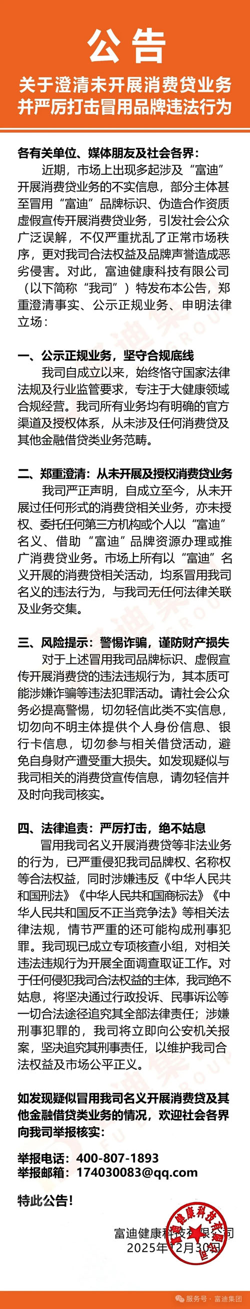 【直报网北京1月13日讯】(富迪) ![]() (原标题:富迪澄清未开展消费贷并严打冒用品牌行为) 责任编辑:一一 【特别声明:部分文字及图片来源于网络,仅供学习和交流使用,不具有任何商业用途,其目的在于传递更多的信息,并不代表本平台赞同其观点。版权归原作者所有,如涉版权或来源标注有误,请及时和我们取得联系,我们将迅速处理,谢谢!】 解读新闻热点、呈现敏感事件、更多独家分析,尽在以下微信公号,扫描二维码免费阅读。