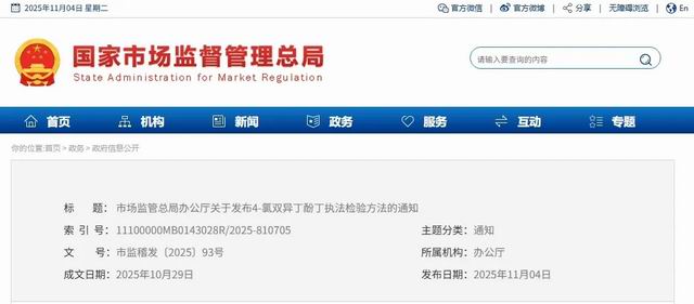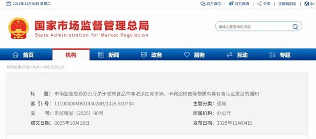 【直报网北京11月5日讯】(庶正康讯)政府干预的出发点是纠正市场失灵!我国营养健康市场长期徘徊在失灵临界点两侧,因此严格监管是优化营商环境的必要之举! 11月4日,国家市场监督管理总局批量发布关于非法添加非食用物质系有毒有害认定意见及执法检验方法的通知。 ![]() 据庶正康讯了解,本次发布的内容包括有: 宣称“减肥”功能食品非法添加有毒有害物4-氯双异丁酚丁执法检验方法; ![]() 宣称“减肥”功能食品非法添加非食用物质西布曲明新型衍生物认定意见及执法检验方法; ![]() 宣称“壮阳”功能非食用物质育亨宾及其系列衍生物或含有该类化合物的卡宾达树皮等物质有毒有害认定意见。 ![]() 今年4月,国务院食安委《中共中央办公厅 国务院办公厅关于进一步强化食品安全全链条监管的意见》正式印发,标志着我国食品安全治理迈入了统筹全链条、全周期、全要素的新阶段。市场监管总局党组书记、局长罗文指出,强化全链条监管是适应食品安全新形势的迫切需要,《意见》以全链条监管为切入点,将“四个最严”要求贯穿于食品生产、流通、储存、消费各环节,推动食品安全治理从事后处置向事前预防延伸、从局部管控向系统治理升级。