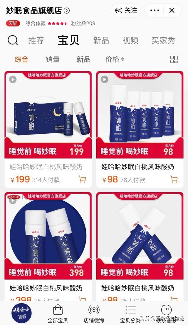 新京报记者注意到,娃哈哈妙眠产品在天猫平台、相关微信公众号以及网站都有销售和招商信息,比如天猫旗舰店将这款产品定名为“娃哈哈妙眠酸奶”。在娃哈哈妙眠刚推出的时候,无论是代言人赵雅芝的广告语还是宣传资料中,宣传语都是“好睡眠,喝妙眠”。近期新京报记者发现,娃哈哈妙眠改变了宣传语,以“睡觉前,喝妙眠”为主。在其他平台,这样的宣称也算得上“标配”。