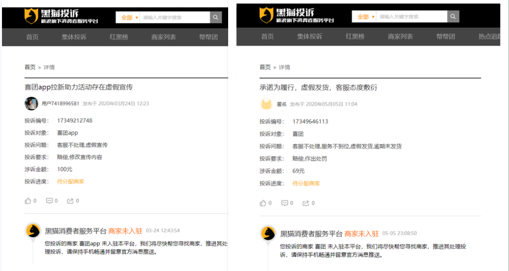 【直报网北京9月10日讯】(舆情观察网)近日,舆情观察网接到一网友投诉,称其在一款名为“喜团”的社交电商购物遭到了“欺诈”。此外该网友指出,该电商平台存在“涉嫌传销”的情况。这是怎么回事呢? 宣传背靠阿里的社区团购平台 公开资料显示,喜团上线仅六个月,已获得千万级美金融资,GMV(成交总额)已过10亿。此外该平台对外宣称是与阿里巴巴合作的社区团购平台。 据天眼查APP显示,喜团隶属于杭州喜团科技有限公司,该公司成立于2019年4月,注册资本2000万元,实缴资本为15万元。但直到今年6月才被核准。该公司注册资金为2000万元,实缴为0,法人代表为胡静波。 在去年12月31日的喜团年终答谢宴上,喜团董事长胡静波高调提出要在2020年美团达成GMV100亿元,月GMV 12亿,日活跃用户500万,日活跃会员100万,联营工厂5000家5W商品,喜团小店开到10000家。 然而舆情观察网注意到,在如此雄心壮志的背后,喜团的豪言壮语却走的异常坎坷。网上更是屡遭消费者的“差评”,舆情观察网在黑猫投诉平台查询发现,不少网友指责喜团的售后服务不作为。如某消费者表示买了一个包包,原价99,搞活动免费送只需自负邮费14元,结果拿到的包包跟图片相差很大。然而联系客服却不予处理。 此外在今年4月,据浙江电视台1818黄金眼栏目报道,有一位宋先生反映,他通过“喜团”买了一批戴森吹风机,全款都付清了,可等了两个月后,对方却表示没货,直接把订单取消了。 宋先生表示,他在喜团的平台上购买了55支吹风机,每支价格是2199元,共计价值10万元左右。平台原本承诺25日内发货,但是过了日期喜团未能发货。而后通过12315协调后平台承诺是2月底发货,但是3月初没有经过我的同意,私自取消订单。”宋先生坦言,他是做数码产品生意的,之所以从“喜团”购买这批戴森吹风机,其实就是想赚个差价。 记者随后赶往喜团公司所在地,却发现公司未有人员办公。记者联系到潘姓经理,但对方回复却闪烁其词。潘经理称是负责供货的公司没货了,也不肯透露负责供货公司的名称及地址。宋先生提出想要去仓库自取遭到了潘经理的拒绝。 宋先生怀疑喜团公司根本就没货,但还是拿优惠活动来揽客,等收了全款后,大不了等几个月后再把钱退掉。宋先生要求公司公开在站内致歉,要么就继续履行合同。潘经理称会把宋先生的诉求转告给公司。 此外不少媒体指出,喜团疑似出现拖欠货款问题。此前有媒体报道,有网友的丈夫被警察带走,原因是他们在在喜团销售产品,平台拖欠货款已经有半年多,喜团却一直没有正面回复解决问题。上午数名供应商一起前往公司讨要说法,结果被当地警察给抓走。 |