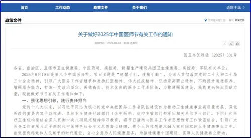 【直报网北京8月19日讯】(和治友德)2025年8月19日是我国第八个中国医师节。这个专属于卫生与健康工作者的节日源于2017年11月3日国务院批准卫健委(原卫计委)的申请,决定从2018年开始将每年8月19日定为“中国医师节”。该节日的设立充分体现了党中央、国务院对全国医疗卫生工作者的高度重视与亲切关怀。 中国医师节 2025年8月4日,国家卫生健康委办公厅、国家中医药局综合司、国家疾控局综合司、中央军委后勤保障部卫生局印发《关于做好2025年中国医师节有关工作的通知》,确定今年8月19日第八个中国医师节的节日主题是——“德馨于行,技精于勤”。 ![]() 图片来源:国家卫健委官网 《通知》要求深入贯彻落实党的二十大和二十届三中全会精神,引领广大医务工作者继承和发扬红医精神、伟大抗疫精神,弘扬崇高职业精神,不断提升道德修养、增强服务能力,打造一支政治坚定、医德高尚、技术优良的医务工作者队伍,为推进强国建设、民族复兴伟业贡献力量。 健康作为关乎国家强盛、社会和谐与人民幸福的重要命题,既是个人幸福生活的根本保障,也是事业发展的核心动力,更是人生成就的价值源泉。长期以来,和治友德持续开展健康养生文化传播、组织实施健康公益活动、推广健康科普知识,并通过产学研协同创新模式,为“健康中国”战略实施贡献力量,不断推动全民健康素养水平提升。