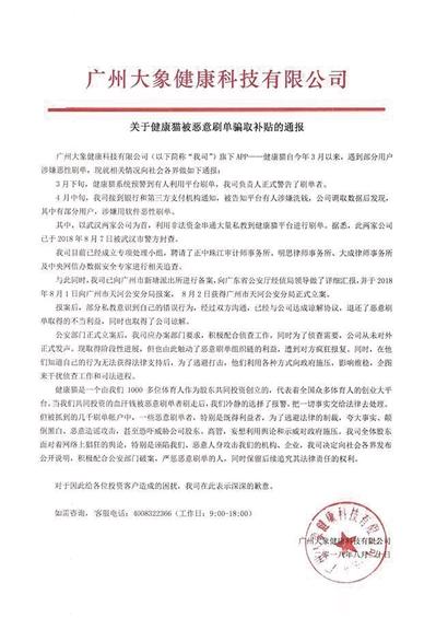 【直报网北京8月27日讯】(综合报道)广州市公安局新闻办公室今天通报:根据群众举报和公安机关调查,今日广州市公安局天河区分局依法对广州大象健康科技有限公司(“健康猫”平台)涉嫌非法吸收公众存款进行立案侦查,抓获该公司法人代表杨某(男,40岁,安徽人)等9名犯罪嫌疑人。 公安机关提醒:受害群众可通过直接向广州市公安局天河区分局经侦大队报案或邮寄报案材料、向户籍所在地或常住地公安机关报案、关注“广州天河公安”微信公众号等方式报案。公安机关同时提醒受害群众要理性合法反映情况和诉求,不得组织或参与各类妨害社会管理秩序、危害公共安全的违法犯罪活动。 ![]() 相关阅读 “健康猫”停止提现殃及25万人 全国各地“受害者”赴穗报案 8月中旬,广州天河区新塘派出所陆续接到来自全国各地的“受害者”报案,声称其被一款运动app“诈骗”,被骗金额少则数万,多则上千万。目前报案人数已超千人,且还在增加中。 记者查询资料得知,这款运动app名叫“健康猫”,上线于2015年3月,专为客户提供教练预约和课程预订服务,是广州大象健康科技有限公司旗下的产品。 该公司官方数据显示,在该平台注册的各类体育项目私人教练有25万人。在平台注册成为私教后可以通过授课赚取课时费以及课时补贴。今年5月开始,健康猫平台出现不能提现的情况。对于停止提现,平台称是私教恶意刷单所致并已报警立案。8月15日,记者联系各方采访。多名私教向记者讲述了他们的遭遇。 ![]() 8月21日,二十余名私教在广州大象健康科技有限公司维权,要求退还课时费,未获回应 鼓励刷单还是恶意刷单? 私教与平台方各执一词 苏敏(化名)是福建晋江某小学的体育老师。2015年12月,她在同事的介绍下成为健康猫平台田径项目的私教并发布课程,而在这三年中,她并未在线下进行过私教授课课程,而是通过“健康猫助手”注册小号,再用这些小号购买自己的课程赚取课时补贴。刚开始一天12节田径课,一节课300元,一天有课时费3600元,每节课她能拿到2%的课时补贴。2016年,苏敏开始在平台发布团购课程,一节课上限人数100人,每人收取50元课时费,这样下来一节课的课时费有5000元。而平台并没有时间限制,苏敏一天可以发布12节课,能刷出6万元的课时费,当时还有2%的课时补贴。 课程结束后课时费即可进入平台账户,补贴则在课程结束10天后进入她的平台账户。确认提现后,她要等上10天才能在个人银行账户上查询到。 现在,苏敏平台账户上有120万元,而她自己实打实投入的金额是60万元,除开小部分积蓄,大部分是通过信用卡贷款来的。 记者了解到,为了吸引私教用户,健康猫在上线最初的3个月里,给予私教的补贴达到课时费的15%,提现3天到账。自2015年6月后,健康猫对私教的补贴率逐步下调到了5%且提现5天到账,此后补贴率又从5%降到2%,到账时间也从5天变成7天,最后调整为10天。 多位早期就加入健康猫的私教表示,平台并未禁止刷单行为,在他们的内部微信聊天群中,相关负责人反而鼓励用户不断用这种方式投钱做业绩。在2017年的大部分时间里,补贴率和提现到账时间维持在1.5%和7天,相对平稳。2018年2月,平台出现一次短时无法提现,然后补贴率骤然升到15%,相继回落到10%和8%。同时,相关负责人对业绩的督促力度也明显加大。贺玉(化名)来自湖南长沙,在健康猫上注册成为私教已有3年,这个时长跨度的私教被称为“铁军”。贺玉称,后期为了“搞钱”,平台相关负责人甚至教私教如何贷款刷单。 除了刷课,私教每邀请一个新人成为私教,都可以获得津贴,根据邀请人数的不同,普通私教可以晋升为小、中、大队长,每月津贴也越高,但只有完成业绩指标才能获得。楚杰(化名)来自北京,作为小队长发展了近20人注册健康猫,2018年2月拿到了500元补贴。 无法提现只因恶意刷单? 公司称已报案并立案 今年5月起,健康猫再次出现无法提现的情况。系统给出的理由也一直在变:银行接口问题、技术人员调试、财务系统调试等等。而点击提现的时候,先是显示提现失败,继而账户里的钱会自动转入个人设置中的“其他收入”中,随后这笔钱会再次转回账户,但金额又多了一些。按照健康猫当时公告的说法,这是由于升级调试期间为弥补私教损失,“系统自动代约”的课时补贴。也正是从这时候开始,贺玉开始意识到可能出问题了。 8月10日,健康猫推送了一份系统公告。在公告中健康猫表示,部分私教用户“利用刷单软件、伙同他人等方式,在公司推广期间,利用公司补贴政策,恶意套现”,并附上了一份已在广州市公安局天河分局立案的立案通知书。 “平台鼓励私教刷单,到最后私教却被告知是恶意刷单。”贺玉感到很愤怒。从2015年到现在,通过不断循环刷单,她投入健康猫平台的金额已经有130万元,这些钱里面包括她通过各种渠道的贷款,而与她一起的40多名私教投入平台总金额超过一个亿,最多的一个人投入了1500万元。 8月中旬,全国各地私教陆续来到广州天河区新塘派出所报案。目前报案人数已在千人以上,而且还在增加中。 ![]() 平台盈利模式有诈? 各地私教陆续到广州报案 周武(化名)是广西某体育院校大二的学生,国家一级运动员。“你没跟上队伍,有好机会,专属于体育人的创业机会。”周武是在老师的宣传下加入到健康猫的,他在平台上发布的是武术课程。如今,他有17万元在平台上