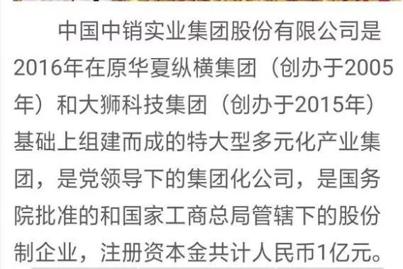 【直报网北京12月20日讯】(菲凡烽火台)大家好, 最近又不少人在后台咨询中销联合。 这种消费返利的骗局,是摆明脸上写着“我是骗子”这几个字。 在这个浮夸的年代只要你敢讲就有人敢信。 我今天就带大家看看有多不靠谱吧。 01 烽火调查 1.中销联合是由岳家军创造起来的一个声称可以在2020年前会成就7亿中产阶级,带领全体中国人实现中国梦的平台。 根据网查资料,中销联合的对外宣称的运营公司是中国中销实业集团股份有限公司,但是在国家工商系统中,并没有找到任何这个公司的信息,也并没有找到华夏纵横集团以及大狮科技集团的工商注册信息,中销联合吹嘘所谓的企业背景,但是实质却没有合法的企业背书,注册公司花费不过几千块钱,中销联合团队却也都不愿意花,简直就是想“空手套白狼”,况且中销联合宣称是一个要带领全体中国人实现中国梦的平台,却连一个合法注册的公司背景都没有,还如何实现带领全体中国人实现中国梦的“伟大愿景”。这种没有公司背书的平台,若是出现维权问题,投资者将难以追讨维权,一是无法获知该平台的实质地址,二是无法找到实质负责人。