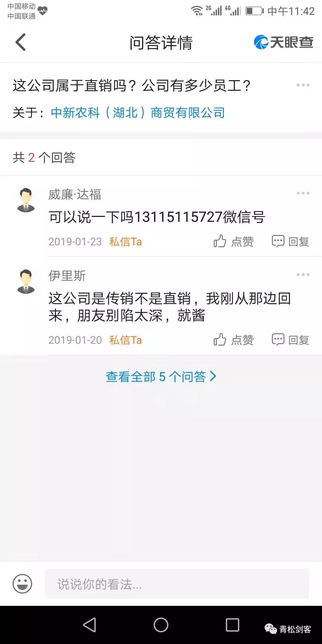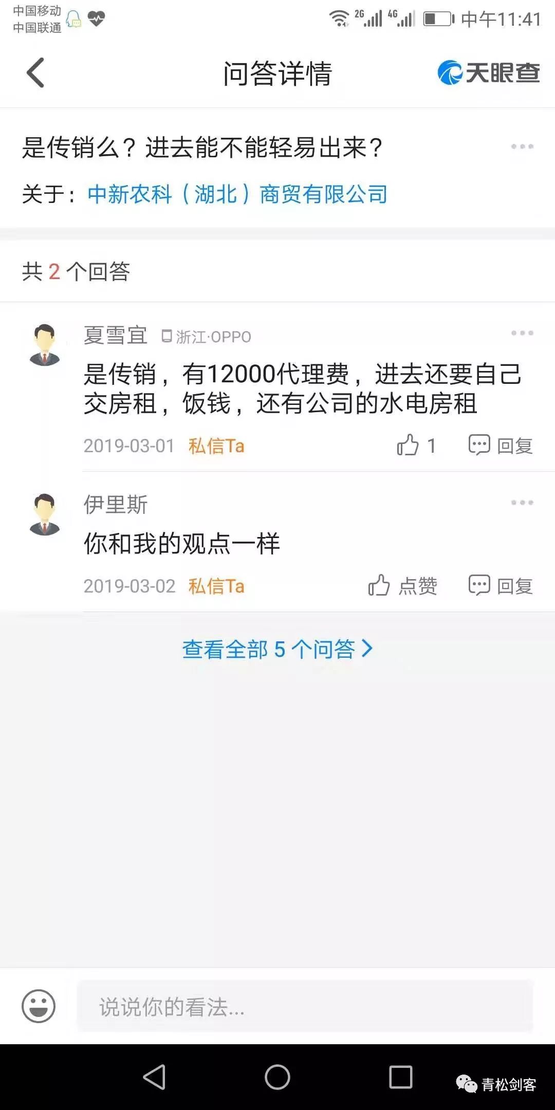 【直报网北京3月12日讯】(青松剑客)近年随着国家对传销组织的不断打击,其生存空间被不断压缩,一些传销组织为了继续行骗不断的去改变自己。近期小编接到投诉,说他进入了传销组织,具体询问得知被女网友骗进去的。但是他们有公司有办公地址。我们来看看这家公司的基本情况。 据受害者提供该公司位于湖北宜都电商小镇一号楼123号中新农科(湖北)商贸有限公司。 我们打开天眼查看一下。 ![]() 再看下网友的回复 ![]() ![]() ![]()