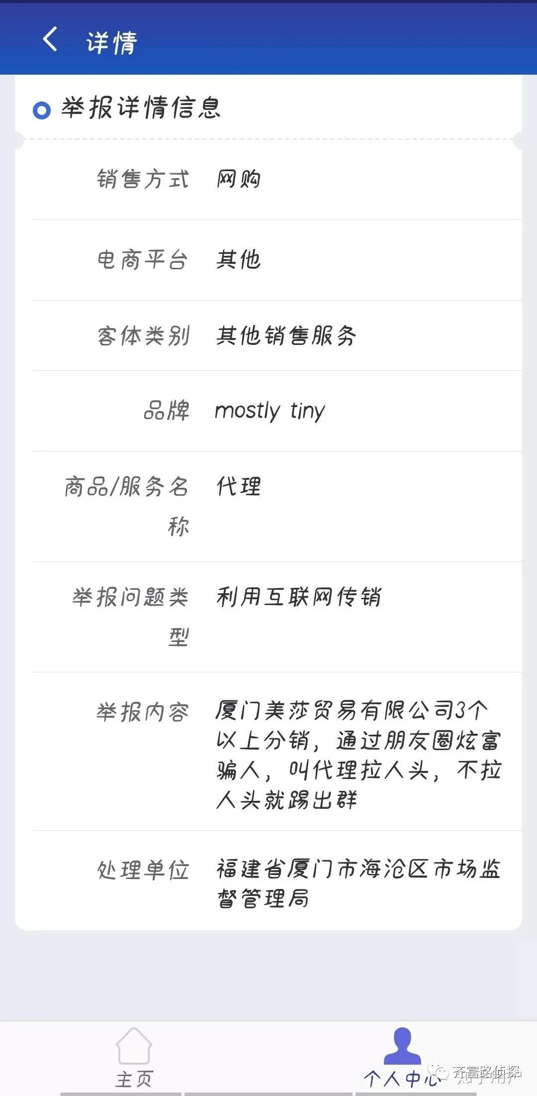 【直报网北京6月18日讯】(齐富路侦探)每当夏日来临,减肥产品就异常火爆。去年,有一款宣称明星们都在用的减肥糖果火遍小红书、朋友圈等社交应用。这款减肥糖果是微商品牌Mostly TINY(以下简称MOS)推出的,减肥糖的爆红也让MOS微商扩大了品牌的知名度。 据了解,MOS是厦门美莎贸易有限公司旗下的化妆品品牌。美莎贸易成立于2015年4月21日,主要经营化妆品及卫生用品批发、食品批发等业务。除了MOS减肥糖,还有MOS奶茶、MOS酸奶、MOS咖啡按摩膏等瘦身产品。 糖果、饮料宣称能减肥,涉嫌虚假宣传 乍一听,又是奶茶又是咖啡的,怎么还能减肥?结果,侦探发现都是些智商税,MOS宣称这些产品加入了各种酶等等让人“高深”的东西因而能瘦身,实际上不仅是伪科学,还有可能伤身。 侦探查询了这些宣称能减肥的产品,无一例外都没有正规的保健品批准文号,要么是固体饮料、要么是糖果,都是些普通食品。而MOS的代理却告诉客户,吃了这些减肥产品再辅以运动和其他节食行为,就能够在短时间内快速瘦身。 普通食品宣称能减肥等作用不仅违反了《食品广告发布暂行规定》,涉嫌虚假宣传,而且如果消费者瘦下来了也是由于运动或节食等行为造成的,并不是因为MOS产品,且不健康的饮食习惯会对身体造成伤害。 在微博上,侦探也发现许多被坑过的消费者吐槽MOS的产品。 一位前MOS代理告诉侦探,“MOS会教我们售后话术,如果客户吃了没作用,就要告诉客户是因为她自己的原因,而不是产品的原因。“ 六级分销模式涉嫌传销 那么究竟是谁在买MOS的产品呢?带着疑问,侦探添加了一位MOS代理。 打开代理的朋友圈,大多是成功吸纳新代理加入的成果分享,只有少部分是针对产品的介绍。在与代理的交流中,代理也只是简单介绍了产品后,便向侦探介绍起了MOS的代理模式。 根据代理介绍,模式代理分为VIP、特约、区代、市代、省代、官方六个级别,首次拿货价格分别为1400元、6000元、5万元、18万元、50万元和160万元。代理称,进货1400元,纯利润大概500~600元左右,进货6000元纯利润大概3000~4000元左右。 看了代理朋友圈内“宝妈半年月入百万”“99年大学生成功升级”,再加上代理天花乱坠的描述,对于一些涉世未深的大学生和经验不足的宝妈群体来说,MOS项目投入少、利润高,赚钱似乎十分容易,不仅能赚点零花钱,说不定还能成为一份大事业,很难不动心加入MOS。 转账图造假、代理费不退,不少宝妈大学生上当 然而事实真的如此吗?侦探进行了深入的调查。 侦探添加了一位自称曾是MOS代理的大学生小法(化名),她爆料称,MOS代理朋友圈的出单图、转账图都是假的,是用软件做出来的,实际上并没有这么多的出单量和新加入的代理。 侦探也在社交网站上发现有人爆料称,“室友假期瞒着家人拿了1400去做这个,原本说四个月还是几个月卖不出去一单就给你退钱,结果根本不给退,她还被她上级忽悠着买了她家一个减肥奶昔,压根没用还两三百。而且基本上没几个人买,她朋友圈发的那些交易截图都是我们宿舍几个人换着头像名字陪她演戏,做假做半年了一单没出,一段时间还会有人查你朋友圈发的东西合不合格。 在一份宣传图片中,Mos自称品牌引流绝对是微商界的NO.1,加入即会送客源、送粉丝、送精准流量。 但知情人告诉侦探,所谓的引流,就是叫你去各种明星超话里评论,说什么包邮送口红啊、送水杯啊各种!根本引流不到真正购买产品的客户,并且还赔了钱。 一位曾做过MOS微商的代理称,“我是19年9月26号交的预订代理,到19年10月26号补齐1400成为正式代理,在补款时候我四处借钱才补齐的。从补齐开始我每天听培训完成任务,但就是出不了单引流不来人,而且我又不可能去卖给亲戚朋友。 我就去问上级我为什么没有引流来人,但给我永远的答复都是我自己的原因才没有人来买我的产品,我现在高一,没有时间和精力去做这些事情,而且自己上级有时根本就不理我,甚至我给她发信息一个星期也可以不回我,只有我主动去找她联系她才会回复!“ 小法还告诉侦探,当她向上级提及赠送客源时,上级代理告诉她只有升级更高级别的代理,才会赠送客源,而当小法升级后,并没有获得所谓的赠送客源。 而当代理想要退出时,MOS却不肯退款。 在一张MOS退款要求的图片中显示,两个月不出单,第一次门槛费全部退款。但下方也提出了4点要求,包括60天每天更新8条朋友圈;朋友圈70%内容为原创;60天加满2000人;找上级一对一教导超过20次。下面一排小字还显示,若卖出一单同样不退款。 如此的要求显然十分苛刻,代理小法直言,若是能达到上述要求,还愁赚不到钱吗?说白了MOS就是不想退钱。 在几经折腾后,侦探发现一位成功退款的MOS代理,她称,MOS让她签署了协议书后才肯退钱给她。 而这份协议书,MOS规定了其不得从事与甲方产品具有相同或类似产品的相关的业务,且没有对期限做出规定。这也就是说,该代理今后都不能够再从事与化妆品、减肥产品等任何与MOS产品类似的产品的业务,否则就违法了协议,面临罚款。 如此这般不退款、退款难的投诉在知乎、贴吧等社交平台上比比皆是。大多以宝妈、大学生为主,MOS利用这些人信息不对称,又想赚点小钱作为零花钱或是信心满满的开启第一份创业的心情,一步步进行利诱,最终致使他们上当受骗。