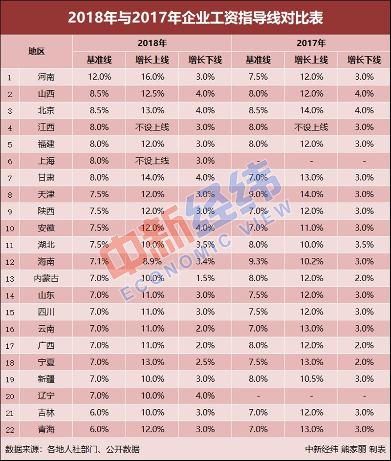 【直报网北京12月7日讯】(中新经纬)截至目前,全国至少已有22个省份发布了2018年企业工资指导线。2018年已接近尾声,你的工资涨了吗? 据中新经纬客户端(微信公众号:jwview)不完全统计,截至12月6日,至少已有河南、山西、北京、江西、福建、上海等22个省份公布了2018年企业工资指导线。 ![]() 虽然已进入12月,全国31省份中,仍有包括浙江、广东、江苏、重庆、湖南等在内的9省份未公布2018年企业工资指导线。值得注意的是,在这些还未公布数据的地区,部分省份仍未公布2017年的企业工资指导线,黑龙江、重庆等地已多年缺位。 20省份增长基准线站上7% 河南涨幅居首 从各地区已公布的2018年企业工资指导线情况来看,截至目前,22个省份中,除了吉林6.0%、青海6.0%,其余20省份的基准线都在7.0%以上。河南以12%居于首位,北京、山西两地基准线以8.5%并列第二。 企业工资指导线制度是政府对企业工资分配进行宏观调控的一种制度,是企业开展工资集体协商的基本依据。由基准线、上线(又称为预警线)和下线构成。 中新经纬客户端(微信公众号:jwview)对比22省份2017年与2018年的数据发现,除了上海、辽宁(2017年企业工资指导线不明确),今年多地企业工资指导线的基准线、上线和下线有所上调。 与2017年相比较,山西、河南、陕西、安徽、甘肃等5省份对基准线进行了上调,其中河南上调最多,由去年的7.5%上调了4.5个百分点,至今年的12%。在上线方面,江西和上海均不设上线,山西、河南、安徽和甘肃4省份对上线进行了上调。从下线来看,安徽、海南、甘肃、宁夏等4省份将下线上调,安徽和甘肃上调幅度较大,同时提高了1个百分点。 值得注意的是,在已公布企业工资指导线的22省份中,只有内蒙古的上线、基准线、下线均有所下降。 那么,工资指导线下降会使工资减少吗?有地方人社部门相关负责人表示,企业工资指导线略有下调,并非意味着工资进入负增长,只是工资涨幅较以往有所下降。只要三条指导线——基准线、下线、上线都不是负数,就意味着政府指导的职工工资增幅都是呈上涨趋势的。 指导线已公布,为何工资还没涨? 在北京工作的90后小徐感到疑惑:“既然工资指导线已经公布了,为什么我的薪水还没涨呢?”关于企业工资指导线需要明确的是,虽然指导线已公布,但职工工资并不是“非涨不可”。 ![]() 资料图 中新经纬 熊家丽摄 据悉,企业工资指导线是政府根据当年经济发展调控目标,向社会发布的年度工资增长水平的建议,并不具有强制约束力。因此,指导线不能强制要求企业涨工资。但工资指导线能够为企业与职工开展工资集体协商,以及企业自身合理确定工资增长水平提供参考依据,同时也是国有企业实现工资总额管理的重要手段。 值得注意的是,即便企业给职工涨工资,不同企业所涨工资也并非一样多。中新经纬客户端(微信公众号:jwview)发现,根据企业生产经营情况和工资支付能力的不同,各地对企业给出了不同的职工工资增长指导意见。 如北京市指出,生产经营正常、经济效益增长的企业,可结合自身实际参照基准线安排本企业的工资增长水平。效益情况与往年持平或略有下降的企业,可结合自身实际参照下线安排本企业的工资增长水平;经营亏损、职工工资发放出现困难的企业,经与工会或职工代表协商,工资可以零增长。