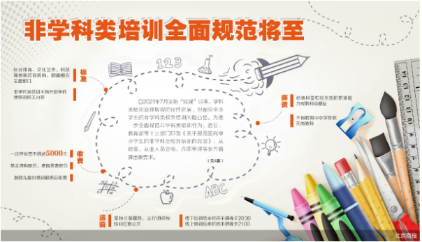 不得聘用在职在岗教师 对于非学科培训的培训师资,《意见》也有明确要求。《意见》强调,非学科类培训的从业人员必须具备体育、文化艺术、科技等相应类别的职业(专业)能力资质。不得聘用中小学在职在岗教师,聘用外籍人员须符合国家有关规定。非学科类机构须依法取得有关主管部门的行政许可后,再依法进行法人登记。要对现有机构进行全面排查、对标整改。 《意见》如何解决非学科类培训从业人员缺乏资质的问题?对此,教育部校外教育培训监管司负责人表示,培训机构的从业人员是否具有相应资质,是衡量一个机构是否正规的重要标准。教育部、人社部在2021年9月印发的《校外培训机构从业人员管理办法(试行)》中,即对非学科类培训从业人员作出规定,要求必须具备相应的职业(专业)能力证明。 针对从业人员资质问题,《意见》除要求所聘从事培训工作的人员必须具备体育、文化艺术、科技等相应类别的职业(专业)能力或具有相应类别的教师资格证外,还规定具体的职业(专业)能力资质标准可由省级以上主管部门明确,以便各部门、各省细化落实。 郁苗也表示,结合目前市场的情况来看,中小培训机构面临的合规挑战更大。因为它们在合规化过程中需要面临重新招聘和培养部分新师资,在此期间可能还会面临部分学员的流失。“好在从《意见》到具体实施细则的产生与执行,中间有一个过渡期,机构可以通过《意见》确定的方向来逐步进行调整,这也是未来长久发展的必由之路。” 做好规范治理配套改革 在对非学科培训的师资、收费和培训时间进行明文规定的同时,《意见》也提出要做好非学科类培训规范治理的配套改革。强化学校教育主阵地作用,促进学生学习更好回归校园。加强音乐、体育、美术等紧缺学科教师配备补充,开齐开足上好音体美课程;统筹利用科普、文化、体育等各方面社会资源,积极聘请退休教师、具备资质的社会专业人员或志愿者等参与支持学校课后服务工作,满足学生多样化学习需求。 北京商报记者注意到,目前市场上主流的非学科培训,包括传统的音体美相关培训,和近年来比较火爆的少儿编程和机器人培训等,均有以课外服务采购的方式进入到公立学校的“课后三点半”中。此次《意见》也明确提出,各地根据需求可以适当引进非学科类培训机构参与学校课后服务,要坚持公益性原则,引进的培训项目费用标准要明显低于培训机构在校外提供同质培训服务的收费标准。 一位非学科培训的从业者向北京商报记者透露,下一步他们也将结合《意见》对进校服务的价格进行相应调整。随着《意见》在各地的进一步落实,校外培训的规范化运营也在稳步推进。