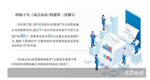 10月23日,经北京商报记者向业内多家消费金融公司确认,《消费金融公司管理办法(征求意见稿)》已经发放至从业机构,相关公司正在推进中,但具体的意见征集周期、调整细则等暂时无法对外披露。 就在9月15日,国家金融监管总局发布2023年规章立法工作计划,提出将制定《银行保险机构操作风险管理办法》、修订《非银行金融机构行政许可事项实施办法》(以下简称《实施办法》)和《试点办法》等。《实施办法》中也涉及到消费金融机构设立方面的内容。 早在14年前,为了加大金融对扩内需、促消费的支持力度,消费金融这一金融业务模式被引入国内。原银监会于2009年7月发布《试点办法》,消费金融公司试点审批工作随之正式启动。2013年11月,《试点办法》进行首次修订,对出资人条件、业务范围以及经营管理规则等方面进行了调整,并一直沿用至今。 时隔十年,《试点办法》将迎第二次修订,并有望摘掉“试点”二字,更名为《消费金融公司管理办法》。针对这一变动,博通咨询首席分析师王蓬博指出,现行管理办法已经是十年前发布的,十年的时间里消费金融行业有着长足的发展,但同时也能看到不足和问题仍然存在。 “当前进行修订是为了更好地适应宏观层面的变化和市场需求,响应国务院发展规划,同时提升消费金融公司的服务能力和风险防控能力,推动消费金融公司业务创新发展。”王蓬博分析道。 而除了还在推进中的《试点办法》修订外,同期确认修订的《实施办法》已经在日前正式落地。10月17日,国家金融监督管理总局公布《非银行金融机构行政许可事项实施办法》,自2023年11月10日起施行,其中便涉及到消费金融法人机构设立。 对比修订前,现行《实施办法》新增“作为消费金融公司控股股东的,最近1个会计年度末净资产不低于总资产的40%”,并要求出资方2年内无重大违法违规行为,删除了原规定中“已整改到位并经银保监会或其派出机构认可”的内容。《实施办法》还新增限制要求“主要股东承诺不将所持有的消费金融公司股权质押或设立信托”。 此外,在出资人变更方面,《实施办法》要求消费金融公司至少应当有1名具备5年以上消费金融业务管理和风险控制经验,并且出资比例不低于拟设消费金融公司全部股本15%的出资人。不过,开业满5年且不涉及实际控制人变更的,不受上述要求限制。 在业内看来,《实施办法》主要对消费金融公司设立、出资人变更、募集发行债务和资本补充工具等方面提出了新要求,《试点办法》有望在更多方面进行“更新”。王蓬博认为,《试点办法》修订中可能会重点关注出资人门槛、消金公司业务范围和经营范围等,包括目前存在的行业乱象,如何加强消费金融公司和助贷机构合作的管理、加强监管措施和提升风控标准、切实保护消费者合法权益,都有可能是此次修订的重点工作。