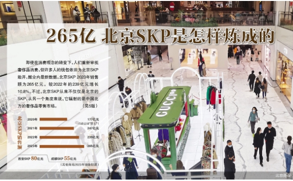 【直报网北京1月5日讯】(北京商报)高端百货SKP交出了2023年的成绩单。 1月4日,时尚商业Daily报道显示,据业内最新数据,北京SKP 2023年销售额为265亿元,较2022年的239亿元增长10.8%;西安SKP销售额达到80亿元,略低于上一年的95亿元;新开业的成都SKP实现55亿元的收入。 针对具体的销售数据及经营情况,北京商报记者向北京SKP方面进行了求证,但截至发稿暂未获得相关回复。