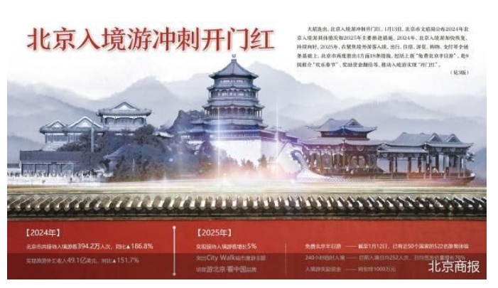 【直报网北京1月14日讯】(北京商报)随着中国不断优化免签政策、完善移动支付,绝大多数景点实行免预约,“China Travel”吸引力持续提升,近期北京国际游客明显增多。2025年,北京将推出四方面18条措施,努力实现接待入境游客增长5%。随着各旅游企业争相更新入境游产品,北京入境游市场有望实现一季度“开门红”。