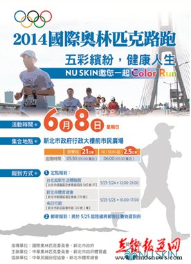 【直报网5月26日讯】(如新)「2014国际奥林匹克路跑」即将于2014年6月8日星期日在台湾新北市市民广场前举办,NU SKIN 如新今年第六度成为中华奥委会路跑的主要赞助企业,所有组别皆以秒杀速度报名额满!今年参与人数超过12,000人,其中NU SKIN 伙伴报名人数突破以往纪录,超过2,000人!让我们当天一起迎着晨曦参与奥运五环Color Run! 5月23日起开放定点报到,若报名时选择在台北如新生活体验馆报到,请在5月23日及5月24日前往台北如新生活体验馆一楼,进行报到并领取物资;5月25日开始邮寄报到。详情请上活动官网。 活动当日 NU SKIN 在现场将设有形象摊位,只要加入「NU SKIN TW」粉丝专页,并上传照片tag #OlympicDay,即可获得限量版 NU SKIN 运动护腕,还将准备Pharmanex生物光子扫描仪及体脂机供伙伴使用!特别邀请长期推展助农运动的好人会馆,现场设置新鲜水果摊位,欢迎伙伴一起支持善的力量,热情参与,奥运五环Color Run! 当天也请伙伴们一起用 NU SKIN 蓝色及有 NU SKIN Logo的饰品,例如:帽子、手环……等装饰物打扮自己,我们一起让 NU SKIN 成为现场的焦点!▲ (原标题:2014国际奥利匹克路跑万人参加 如新支持善的力量) 责任编辑:小申 |