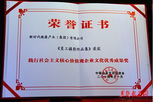本届年会以“践行社会主义核心价值观、助力企业转型升级”为主题 ,大致分专题报告、先进经验介绍、宣传片展映和现场表彰等环节 。期间,国家发改委、国务院国资委、中国文联、中国企业文化促进会的相关领导和来自全国各地不同行业的两百多家会员单位的领导、基层文化工作者近300人共聚一堂,深入学习领会习近平总书 记关于培育和践行社会主义核心价值观的重要讲话精神,交流研讨 以践行社会主义核心价值观推进企业文化建设的新经验和新做法。 在企业文化建设先进单位经验交流环节,公司总经理黄永刚现场作 了题为《知行合一 以文化引领企业发展》的主旨演讲,从践行社会主义核心价值观“爱国是核心,富强是关键;和谐是基础,友善是标准;诚信是根本,文明是追求”三个层面,系统而全面地介绍 了新时代健康产业集团在大力弘扬社会主义核心价值观、以文化引领企业发展方面的行动与努力,受到了与会各方的热烈响应和充分肯定。 会议现场播放了新时代健康产业集团、中铁工程装备集团、天冠集团等四家“全国企业文化建设示范基地”的企业文化宣传片,公司题为《责任创造历史,文化引领未来》的宣传片为与会人员留下了深刻印象。 会议还表彰了企业文化建设模范单位、突出贡献人物、突出贡献工作者等先进集体和个人。公司总经理黄永刚获评“企业文化建设突出贡献人物”,贾培蕊主任获评“企业文化建设突出贡献工作者”,公司企业文化手册和员工摄影作品集双双被评为“践行社会主义核心价值观企业文化建设优秀成果奖”。