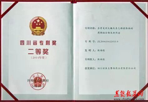 【直报网4月29日讯】()2015年4月23日,由四川省人民政府主办的2014年度四川省专利奖颁奖仪式在成都举行,好医生集团福能源发明的“含有美洲大蠊及其乙醇提取物的药物组合物及新用途”项目获得2014年度四川省专利二等奖。 为实施创新驱动发展战略和知识产权战略,根据《四川省专利实施与产业化激励办法》,四川省政府决定授予41项发明专利2014年度专利奖,授予“含有美洲大蠊及其乙醇提取物的药物组合物及新用途”等10项发明专利、实用新型专利或外观设计专利四川省专利奖二等奖,以激励一批掌握关键技术专利权的产品和企业做大做强。