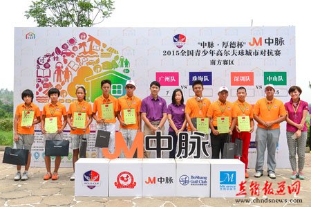 回宏亮先生与何仲铧先生为冠军广州队颁奖 中脉中国区媒体外事副总裁回宏亮先生和狮子湖乡村俱乐部总经理何仲铧先生为冠军队伍广州队颁发奖牌、荣誉证书,中国青少年高尔夫球协会刘荣耀先生为广州队穿上代表“中脉·厚德杯”荣誉的冠军蓝夹克。广州队领队梁旭阳先生也发表了感言:“很感谢高协和各单位的付出,为孩子们提供这么好的一个平台,广州队很荣幸夺得了冠军,同样深圳、珠海、中山各队的实力也不容小觑,很高兴看到青少年高尔夫的水平正在不断的提高”。同时,梁领队表示对广州队的表现非常满意,他们赛出了风格赛出了水平,更值得表扬的是胜不骄败不馁的精神。接下来,广州队也更要在比赛中寻找不足好好训练,为总决赛做准备。 |