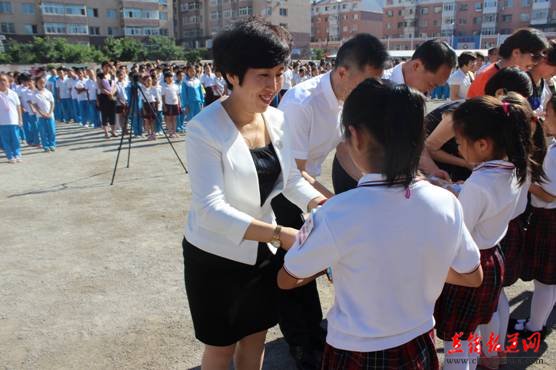 谭秀玲女士带领爱心志愿们向学生代表赠书 随后45位爱心志愿者代表在温馨的音乐中向各年级学生代表赠送书籍,学生们用敬礼和拥抱表达了他们对爱心志愿者们的感谢。面对一本本崭新的图书,学生们的脸上难掩幸福的笑容。 |
