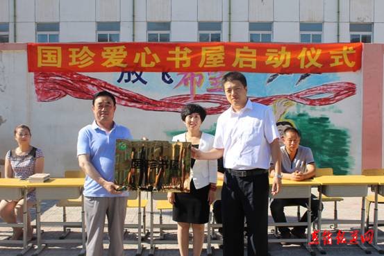 谭云佳先生(右一)和谭秀玲女士(右二)向学校赠送国珍书屋牌匾 首先新时代辽宁分公司总经理谭云佳先生和0510号生活馆馆长谭秀玲女士向胜利小学赠送“国珍书屋”牌匾。