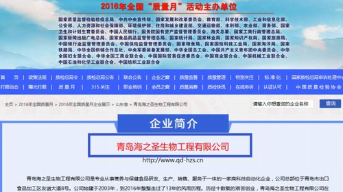 中国经济网、中国消费网 质量工作经验业绩 青岛海之圣生物工程有限公司自2003年建厂以来,先后通过了GB/T19001-2008/ISO9001:2008(质量管理体系)认证、G/T22000-2006/ISO22000:2005(食品安全管理体系)认证、HACCP认证、GB/T24001-2004/ISO14001:2004(环境管理体系)认证和GMP认证,并严格按照国际标准化质量管理的要求,建立了质量管理和质量保证体系,成立了质量管理部,并设置质量管理和质量保证专员,从而确保公司质量管理模式统一、标准统一、方法统一、结果统一。在公司范围内质量管理部对原材料质量控制、工序质量控制、最终出厂质量控制、市场质量控制做到了文件化、规范化、制度化、数据化的管理,为公司的产品生产和质量管理工作打下了坚实的基础。 |