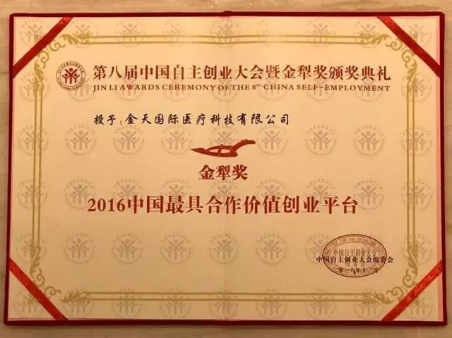 “金犁奖”是目前中国中小企业领域的最高奖项,目的是表彰和奖励对中国经济发展做出突出贡献的中国创业者,以彰显创业在我国经济建设中的重要影响和作用,持续推动中国企业、创业领袖成长与成功。而金天国际自1991年成立之初,即希望通过研发一种全新的健康养生科技实现让生命充满活力的目标,籍此开创一个全新的商业模式,为千万有志之士提供优质创业平台,并在此基础上形成一个蓝海的产业,以产业发展推动中国经济改革创新和可持续增长。本届创业大会之“金犁奖”颁奖典礼上,金天国际荣膺“2016中国最具合作价值创业平台”荣誉称号,企业独创的融合“互联网+大众创业”理念的“三维动态式特许专营模式”经5年时间市场检验,真正意义实现了“无忧创业”的目标,完美诠释了“合作共赢”的价值理念,成为创业者首选的最具合作价值事业平台。 ![]() (金犁奖颁奖典礼现场) ![]()