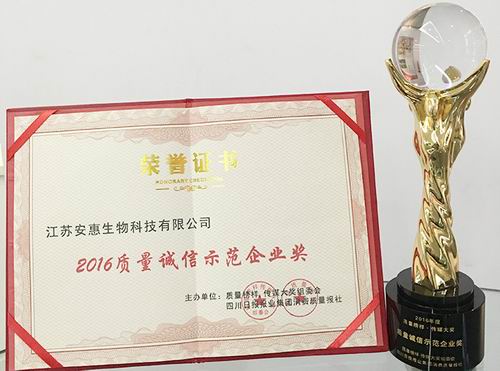 【直报网北京2月23号讯】(安惠)近日,江苏安惠生物科技有限公司荣获 “2016质量诚信示范企业奖”。 “第六届‘质量榜样·2016年度传媒大奖’”大型评选活动自2016年11月29日正式拉开帷幕,由质量榜样传媒大奖组委会、四川日报报业集团消费质量报主办,消费质量手机报、消费质量网、消费质量报官方微博、微信公众平台等全媒体立体传播平台协办。评选活动中参评企业近2000家,投票总数超过30万票。安惠公司以高度的责任感,践诺守信,将诚信融入企业的血脉,在此次活动中赢得众多消费者认可和赞扬,从中脱颖而出,荣获“2016质量诚信示范企业奖”。 安惠公司始终坚持以质量取胜的经营方针,公司拥有强大的科研团队,配备先进的生产设备,遵循严格的质量管理制度,确保安惠产品始终如一的高品质。公司已通过ISO9001质量体系认证、ISO14001环境管理体系认证、ISO28001职业安全体系认证、ISO22000食品安全管理体系认证、保健品良好生产规范GMP认证、HACCP食品卫生安全管理体系认证以及出口食品注册登记。
