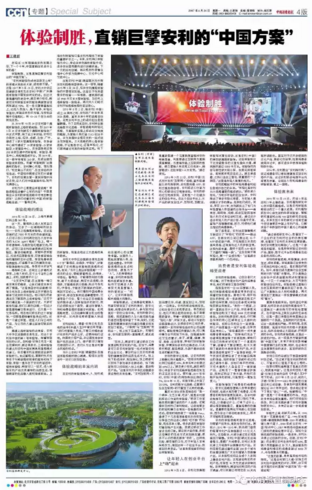【直报网北京4月26日讯】(中消报)2017年4月24日,中国消费者报用整版篇幅,发表文章《体验制胜,直销巨擘安利的“中国方案”》,全面深入地介绍了安利的直销“中国方案”。 以下为报纸全文刊出的内容。 体验制胜,直销巨擘安利的“中国方案” 王建新 在经过10年稳健有序的发展之后,下一个十年,中国直销应该走什么样的路? 体验制胜,这是直销巨擘安利给出的“中国方案”。