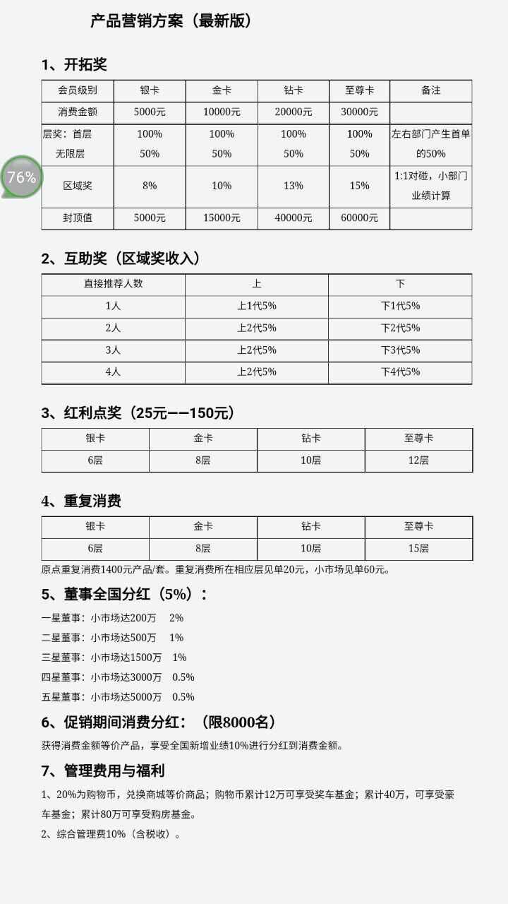 公司高管团队:天琦生物董事长黄正梅女士,正大肽琦董事长周爱兵先生,总裁李祥先生、运营副总裁李洋先生、常务副总裁陈书芳先生、市场部总监刘红女士、电商部总监刘勇先生、教育部总监徐石松先生。 ![]() 上图为黄正梅董事长、李祥总裁、周爱兵董事长、李洋副总裁 ![]() 七大系统番号是:明德国际的刘萍女士、021明道天爱的刘明先生、中盈国际的程结兵先生、168的赵文智先生、圆梦的许鹤新先生、智联的夏绎绮先生、合力的刘启文先生。 正大肽琦奖金制度如下: ![]() 正大肽琦官网: http://www.jszdtq.com 关于正大肽琦直销市场发展状况,直销头条网将会持续关注。 (原标题:江苏正大肽琦生物有限公司涉水直销) 责任编辑:小宇 解读新闻热点、呈现敏感事件、更多独家分析,尽在以下微信公号,扫描二维码免费阅读。