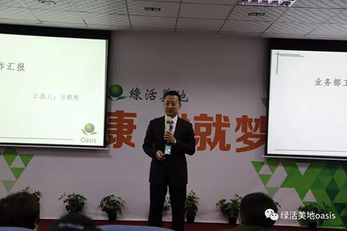 随后,绿活美地业务总监孙鹏程先生向与会的经销商伙伴们详细讲解了市场基本情况及公司最新推出的年终各项回馈政策;许辰宇总监就会议的报备流程进行了精彩分享。经销商伙伴们深度体会课程精髓,会议现场气氛融洽。 ![]() 图为孙总监宣导促销政策 ![]() 图为许总监做精彩分享 最后,苏总就本次会议做出总结,并宣布了下月度市场营销经理会议的时间,届时将向大家宣导2018年事业规划及公司更多利好消息,诚挚欢迎各位经销商伙伴的到来。