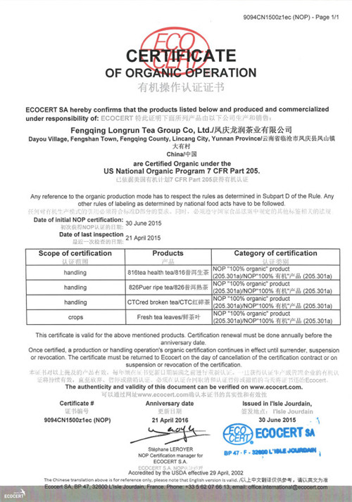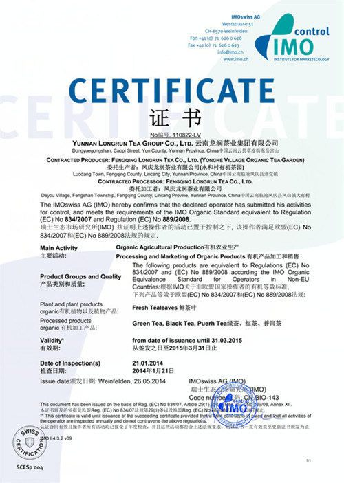 【直报网北京10月19日讯】(理想科技)龙润茶秉承“好茶是种出来的”,从源头把控产品质量,对每一片原叶细心呵护,对每一个茶产品严格把关,让消费者体验到每一个产品背后都凝聚着一份高度的责任感与科技的力量。 占据“世界茶源”的上风上水 98°~102°,22°~25°的天然经纬度:龙润茶种植基地集中位于世界茶树原产地东经98度~102度,北纬22度~25度,占据澜沧江流域核心产茶区的上风上水。 1800米的黄金海拔:龙润茶种植基地是世界上离太阳最近的茶园,平均分布在1800米的黄金海拔,蕴涵低纬度、高海拔的纯天然、原生态的天赋神韵。 6层次生态系茶园:龙润茶依据茶树具有喜温、喜湿、喜漫射光和散射光的特性,建立了以山、河流、自然植被的环境隔离带,通过改善土壤理化性质和科学管理,建立了一个茶树、气候、土壤、动物、植物、微生物6层次结构的生态系茶园。 ![]() 紧抓第一车间 龙润茶“紧抓第一车间”,始终坚持将“第一车间”放在茶园、茶农上,积极推广有机生态茶园建设,牢牢从源头控制产品质量。龙润茶种植基地经国家科技部、云南省科技厅、中国茶科所等部门及专家通过实地调查生态环境、栽培方式、加工条件,并将茶叶、土壤等抽样带回检测,种植基地通过了“出口植物源性食品原料种植基地检验检疫备案”,相继通过了欧盟有机认证(ECO)、雨林联盟认证(RA)、美国有机认证(NOP)、日本农产品有机认证(JAS)、良好农业规范认证(GAP)、中国有机认证(CNAS)等,使生产过程在国际一流的严格管理控制下执行,保证每一份产品传递到消费者手中的是一份安心和放心。 ![]() 每一个认证,都是一份勋章 龙润茶获得的每一个认证证书,都是实力的证明,那么接下来就简单给大家阐述一下龙润茶的几个认证: 欧盟有机认证(EOS) ![]() ECOCERT(简称ECO)欧盟有机认证,是世界最具代表性及权威之有机农业认证机构。ECOCERT严格按照ISO 65导则(等同于欧盟EN 45011导则)要求进行业务运作,在国际上享有良好的声誉,其认证标志得到消费者和有机行业的普遍认可。由于ECOCERT获得了欧盟权威机构、美国农业部(NOP)(为首批获得美国农业部认可的4个国外认证机构之一)、日本农林水产省(JAS)及中国认证认可监督管理委员会(CNCA)的认可,而且还可以按照英国土壤学会Soil Association、瑞士有机标准BioSuisse等标准进行认证。因此,可以说ECOCERT认证证书是中国有机产品进入世界几乎所有有机市场的保证。 ECOCERT机构严苛的质量考核和认证程序,使任何贴有ECOCERT认证标志的产品都成为一种高品质和高信誉度的保证,为追求环保有机的全球人士所认可和推崇。 雨林联盟认证(RA) ![]() 雨林联盟(RA),是非赢利性的国际非政府环境保护组织,也是国际森林认证体系(FSC)认可的最大的和最权威的专业“FSC”认证机构。其使命是通过改变土地利用模式、商业和消费者的行为来保护全球的生态系统和以此为生的人类及野生动物,实现生物多样性保护和可持续的生产、生活方式。 美国有机认证(NOP) ![]() 国家有机工程NOP(TheNationalOrganicProgram)是美国农业部的组成部分。美国最权威的有机认证是美国农业部的USDA标准。USDA的标准极为苛刻。产品包装上印有USDA标识的产品是官方认证100%使用了有机成份。任何打算在美国市场上出售有机产品的生产商和经销商,都必须(根据该国农业局)通过NOP的认证,而且NOP的认证是由美国农业局签订合格的。有机成份供应商也必须由NOP认证。 瑞士有机认证(IMO) ![]() 瑞士生态市场研究所(IMO,Institute for Marketecology)是瑞士生态基金会的下属部门,属于政府支持的非盈利的单位,1990年在瑞士正式注册,其总部设在瑞士,是一个有着多年经验,在全世界享有崇高信誉的专业认证机构。也是首批从事全球环境友好产品检查、认证和质量控制的机构之一。IMO全球范围的活动被瑞士认证机构(SAS)根据全球认证标准EN 45011(ISO 65)认可。据欧共体权威部门统计,2001年,进口欧共体的有机食品中,IMO认证的产品占所有机构认证数量的第二位。 日本有机农业认证(JAS) ![]() 日本有机农业标准(JAS)是日本农林水产省对食品农产品最高级别的认证,即农产品有机认证。日本在有机农产品验证管理上规定非常严格,凡标示为「有机」之农产品,就必须经由政府登录之验证机构办理验证合格。登录之验证机构所验证对象包括生产过程管理者(生产农户)、制造业者、分装业者及进口业者等。 良好农业规范认证(GAP) ![]() GAP是良好农业规范(Good Agricultural Practice)的简称,是主要针对初级农产品生产的种植业和养殖业的一种操作规范,关注动物福利、环境保护、工人的健康、安全和福利,保证初级农产品生产者生产出安全健康的产品。它是以危害分析与关键控制点(HACCP)、良好卫生规范、可持续发展农业和持续改良农场体系为基础,避免在农产品生产过程中受到外来物质的严重污染和农事过程不当操作带来的产品危害。 中国有机产品认证 ![]() 中国有机产品认证属于产品认证的范畴,按照国家质检总局《有机产品认证管理办法》、国家认监委《有机产品认证实施规则》等法律法规和GB/T19630《有机产品国家标准》,企业要想将自己的产品作为有机产品销售,必须通过有机认证。 生产要求:生产基地在近三年内未使用过农药、化肥等禁用物质;种子或种苗未经基因工程技术改造过;生产基地应建立长期的土地培肥、植