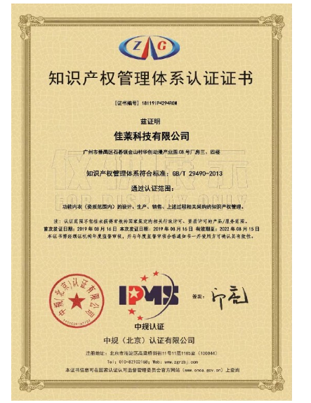 知识产权管理体系是国家牵头制定的一项国家标准,旨在帮助企业建立科学、标准化的知识产权管理制度,形成贯穿生产经营各个环节的知识产权管理体系,实现对知识产权的获取、维护、运用和保护,提升企业的国内外竞争力,保障企业的可持续发展。 对企业来说,“贯标”就是贯彻《企业知识产权管理规范》(GB/T 29490-2013)国家标准。该规范是我国首部企业知识产权管理国家标准,于2013年3月1日由国家知识产权局制定,国家质量监督检验检疫总局、国家标准化管理委员会批准颁布并开始实施。 作为一家集研发、生产、经营为一体的高科技企业,自成立以来,佳莱秉承“仁爱、健康、和谐”企业核心价值,始终坚持自主创新,持续大力投入科技研发,以独特核心技术,引领科技创新突破。 在国家的号召与政府的扶持之下,佳莱在科技研发道路上不断前行,并取得了一定的成果,获得了国家颁发的各项专利证书。此次获得“知识产权管理体系证书”,再一次彰显了公司的技术实力。