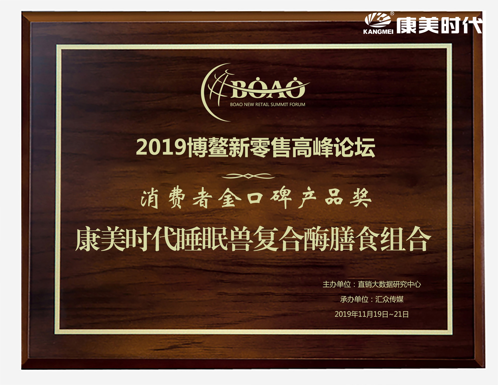 朱总在工作中更看重勇于探索的创新精神,他认为企业家必须有随时面对困难和挑战的积极心态和大刀阔斧、勇于改革创新的勇气,善于从社会大趋势中去捕捉商业机遇,而他本人总能用革新立异的新思维,带来适应时代潮流的新模式,引领康美时代走在行业的前端!他是年度影响力企业家,更是管理者中非凡的楷模! 爆品睡眠兽获“消费者金口碑产品奖” 康美时代睡眠兽复合酶膳食组合上市一年多以来,用它独领风骚的黑科技和浓浓的匠心加持,在整个减脂行业掀起一波又一波的浪潮,帮助无数肥胖人群养成健康的生活方式,并成功瘦身蜕变,荣获2019博鳌新零售高峰论坛“消费者金口碑产品奖”。