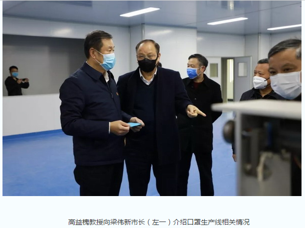 梁伟新市长现场察看了口罩生产线场地,听取了高炜总裁关于口罩生产线建设情况的简要汇报,详细地询问了企业许可证办理、原材料采购、设备调试、生产线试产开机等方面的情况,并查看了试生产出的口罩产品。