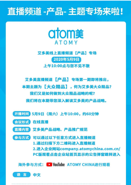 【直报网北京5月7日讯】(艾多美中国) 直播频道一产品-主题专场来啦! ATOMY 艾多线上直播频道【产品】专场 2020年5月9日 上午10:00点与您不见不散 艾多美直播频道【产品】专场第一期即将推出,本期主题为【大众精品】,何为艾多美大众精品?我们又是如何做到大众精品战略的呢?我们将在本期带您深入解读艾多美的产品战略。 开播时间5月9日(周六)上年10:00,约60分钟 会议形式)在线直播 直播内容艾多美产品战略、产品推广规范 参与方式可以通过以下任意方式进入直播频道 1.通过扫描下方二维码进入直播频道 2.进入企业网站company.atomychina.com.cn/PC版观看点击企业站首页显示的公告弹窗跳转进入 海外参与方式: Youtube ATOMY CHINA进行观看 语言中文 5月后续场次安排如下: 产品专场5月27日(晚上19:00) 公司专场5月16日、5月23日、5月30日(上午10:00) 详细场次内容信息我们会通过【艾多美企业站官网)】首页弹窗中持续更新发布,请大家提前做好日程安排,我们诚邀您的参与!