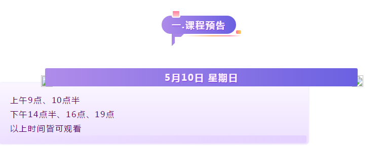 5月10日,星期日 9点、10点半、14点半、16点、19点 均可观看 在线课程有人数限制 建议准备好本本和笔