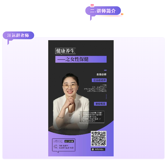 汪远超老师将给我们带来《健康养生之女性保健》在线课程。 汪远超老师将为我们科普女性保健知识,讲解关于“大姨妈”的那些事儿,例如月经提前、月经推迟、月经量过大或过小、月经紊乱的原因及表现,并为大家带来调养方案。 无论你是关爱妈妈、关怀妻子、或者你自己就是一名女性,都应该参加这堂课。同时,还有超值秒杀活动等着你哦,产品很惊艳,价格更能让你“惊掉下巴”。