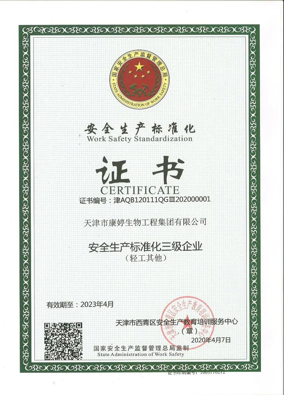 天道酬勤,全体康婷人为此付出的所有努力都是值得的。此证书的获得,不仅使安全标准化管理进一步提升,也标志着我集团的安全生产水平跃上了一个新的台阶,为保障企业安全生产迈出了重要的一步。 安全生产标准化工作是企业通过制订各种安全操作规程、安全管理制度等安全标准,将各部门、各环节的安全生产工作有机结合,同时遵守国家和行业标准,让影响安全生产的设备设施、作业环境和职业危害等因素处于安全稳定状态,真正落实安全生产主体责任,从根本上保障企业安全生产。 集团自成立以来,一直秉承着“安全始于责任”这个安全理念,进行严格要求和管理。