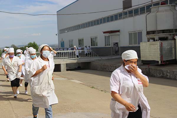 15:30,演练正式开始:火灾警报在紧张生产的车间突然响起,通讯组通过消防广播系统发出警报,并拨打了火警电话,抢险组、疏散组、救护组、后勤组接到指令后各司其位,根据预案穿戴好装备、带上应急设备,迅速进入状态各司其职,应急疏散组组长在各安全口为员工紧急疏散指明方向,一个断后确保车间人员全部撤离火灾现场。大家在演练过程中用袖口捂住口鼻然后弯腰在3分钟内快速有序地都跑到了厂区应急避难场所篮球场,后勤保障组随后在集合点清点各部门人员是否全部安全撤离时发现,有一名员工在逃生中被困,救护组立即启动前往事故现场实施营救,最终公司人员全部安全撤离。